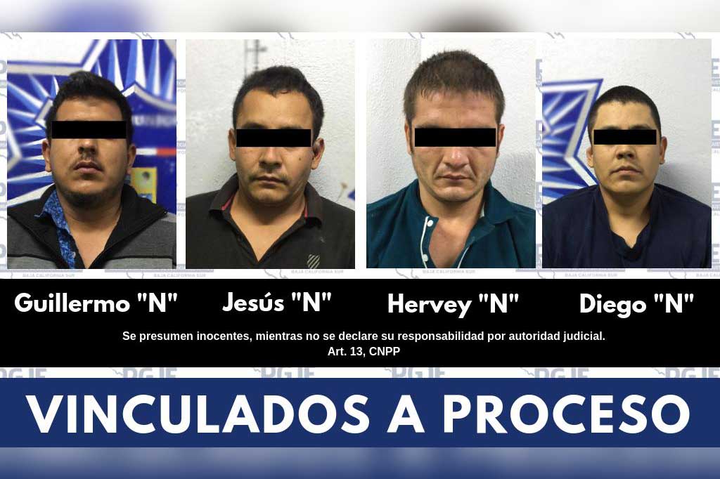 Posteriormente, la audiencia en la que se vinculó a proceso y decretó prisión preventiva a Guillermo “N”, alias “El Memo”, de 29 años de edad, originario del estado de Sinaloa; Hervey “N”, alias “El Güero”, de 21 años de edad, originario de, estado de Sinaloa; Diego “N”, alias “El Diego”, de 26 años de edad, originario de La Paz y Jesús “N” alias “El Teto”, 28 años de edad, originario del estado de Sinaloa, a quienes se relaciona en diversas Carpetas de Investigación por homicidio y como integrantes de célula delictiva.