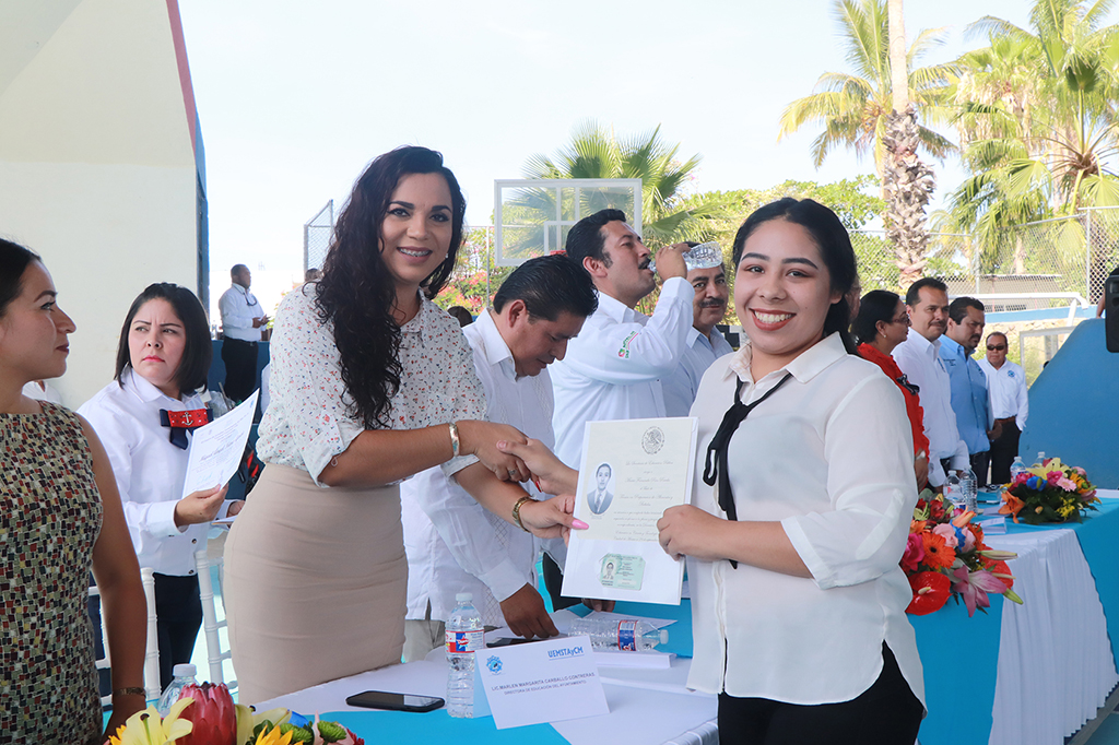 En representación del presidente municipal Arturo De la Rosa Escalante, se contó con la presencia de la maestra Marlene Margarita Carballo Contreras, jefa de la Dirección de Educación del Gobierno de Los Cabos, quien en su discurso habló a los jóvenes egresados, donde destacó el importante trabajo de padres y maestros en favor de su educación y que se refleja en este acto de entrega de documentos que acredita la finalización de sus estudios tecnológicos.