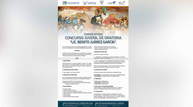 El Ayuntamiento de La Paz a través del Instituto Municipal de la Juventud en coordinación con el Instituto Sudcaliforniano de la Juventud, convoca a participar en el Concurso Juvenil de Oratoria “Benito Juárez García”, con la finalidad de promover los espacios de expresión y participación en los jóvenes paceños, así lo dio a conocer Roberto García.