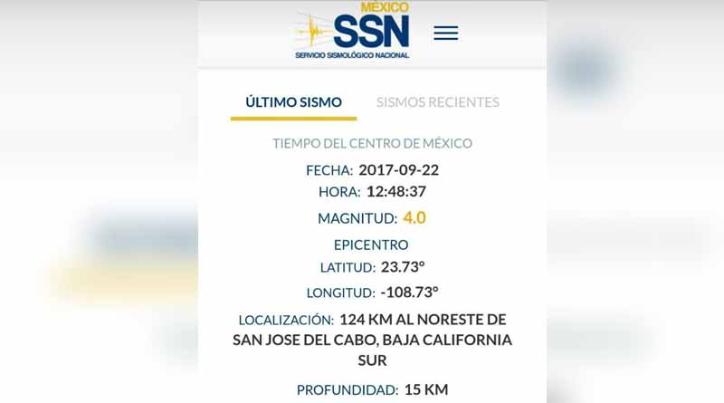 El epicentro fue localizado a 124 km al Noroeste de San José del Cabo con una profundidad de 15 km.