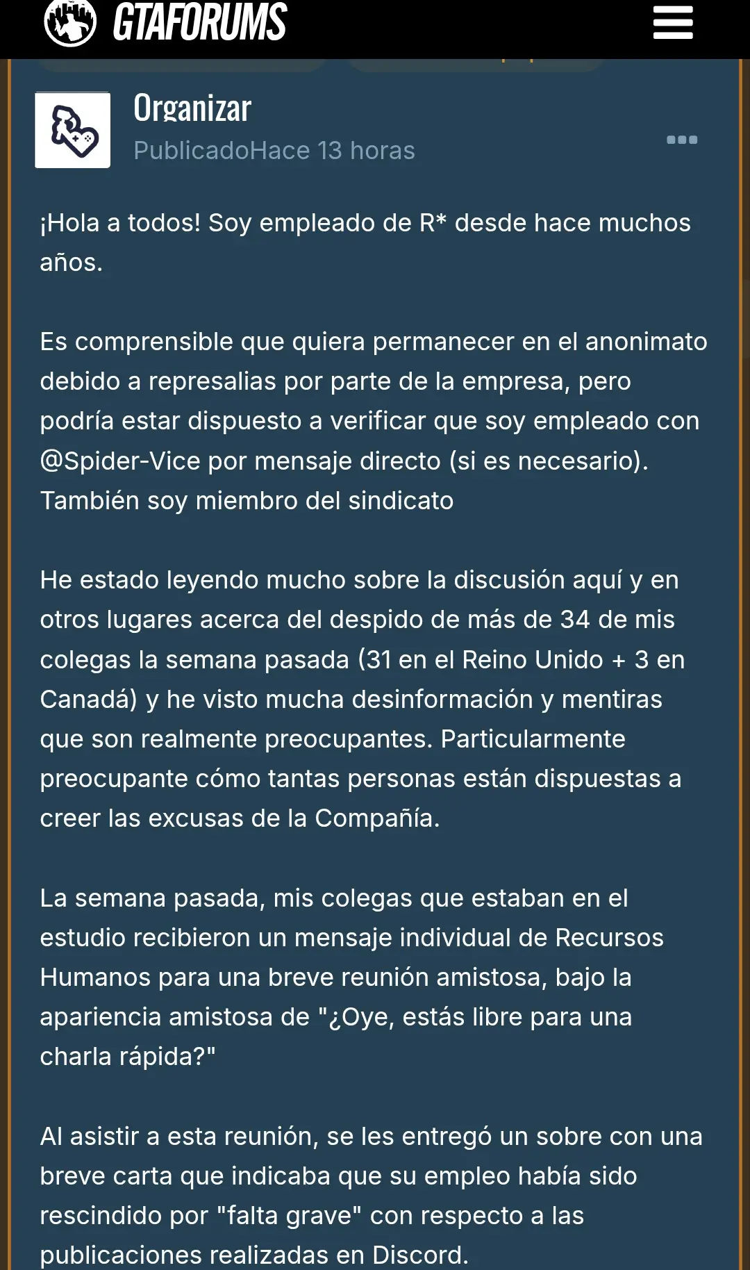 Un trabajador anónimo, cuya identidad fue verificada por el equipo de moderación del sitio web GTAForums, ha revelado detalles críticos sobre el ambiente laboral y las presuntas represalias en Rockstar Games.