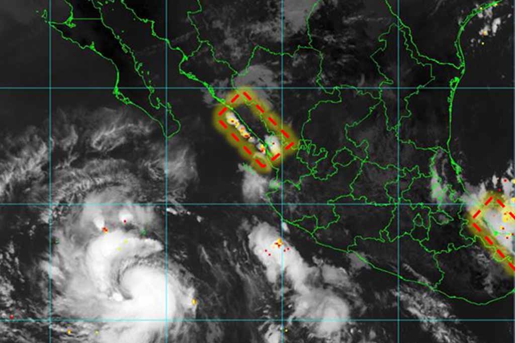 Detalló que las bandas nubosas del sistema refuerzan el potencial de tormentas de muy fuertes a intensas en Nayarit, Jalisco y Colima, y de lluvias con intervalos de chubascos en Baja California Sur.