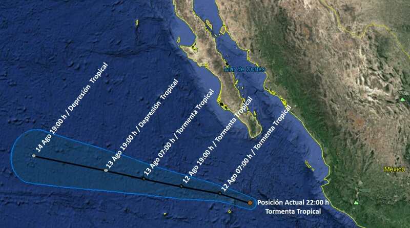 Se localiza a 130 km al este-noreste de Isla Socorro, Col., y a 400 km al sur de Cabo San Lucas, BCS y se desplaza en dirección oeste-noroeste (285°) a 22 km/h.