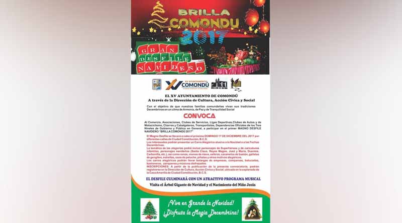 Con el objetivo de que las familias comundeñas vivan sus tradiciones decembrinas en un clima de armonía, de paz y de tranquilidad social, el Ayuntamiento de Comondú, llevará a cabo el primer Magno Desfile Navideño, “Brilla Comondú 2017”, dio a conocer el responsable de Acción Cívica, Social y cultura, Alejandro Márquez Gálvez.