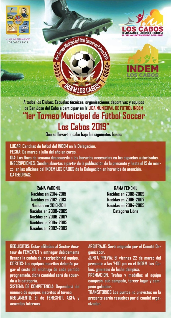 Los Cabos, BCS., 04 Marzo (Gobierno de Los Cabos). – El Instituto del Deporte del Municipio de Los Cabos (INDEM), que dirige Perla Castro Perpuli, anunció la convocatoria de la primer Liga Municipal de Fútbol Soccer, la cual dará inicio en marzo del año en curso.