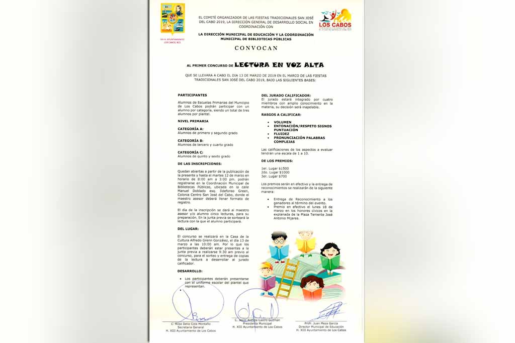 Los Cabos BCS., 07Mar (Gobierno de Los Cabos). – Con el propósito de fomentar el hábito y el gusto por la lectura, así como una sana competencia; el Gobierno de Los Cabos y el Comité Organizador de las Fiestas Tradicionales San José 2019, a través de la dirección general de Desarrollo Social, la Dirección Municipal de Educación y la Coordinación Municipal de Bibliotecas, invitan a todas las escuelas primarias a participar en el primer concurso municipal de lectura en voz alta.