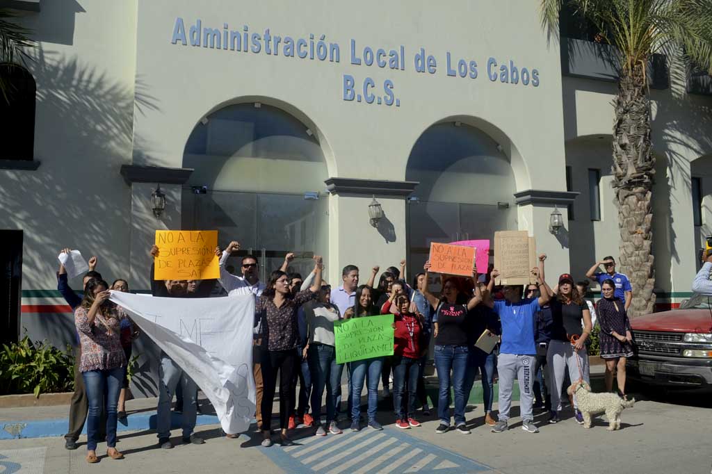 Cabo San Lucas.- Este medio día, un grupo de trabajadores del Servicio de Administración Tributaria de Los Cabos, se manifestó a las afueras del edificio por los despidos masivos a los que han sido sujetos en estos últimos días.